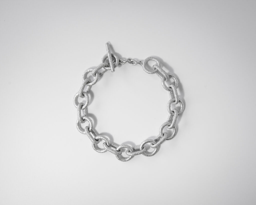 ボリュームのあるシンプルなチェーンブレスレット。こちらは日常使いに最適で、どんなお洋服にも合わせやすく毎日つけたいアイテムです。丸と楕円を交互に組み合わせ、正面から見ると丸の輪っかが見えて可愛らしさがあります。側面は楕円の輪っかが見えてまた違った表情に。内径と外径の差があるので、通常より大きめのサイズでご注文してください。例えば手首約15cmだったら、19.5cmをおすすめします。自分の手首プラス4.5cmに近い長さがよいです。