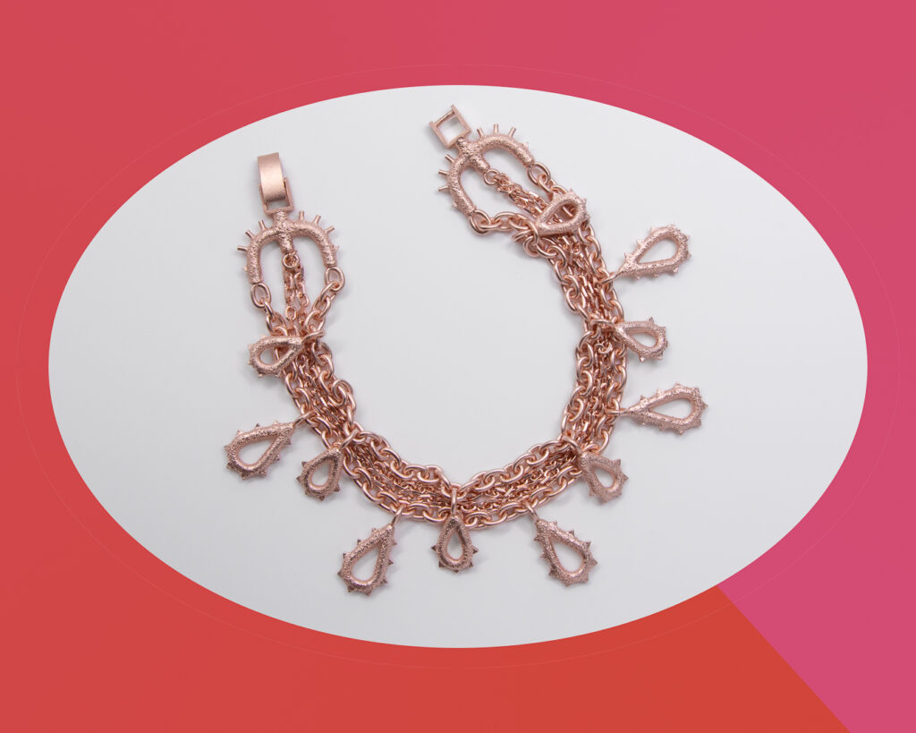 トゲトゲ付きの雫型チャームがじゃらじゃら揺れて可愛いかっこいい、なブレスレット。チャームは大小2種類がついています。チェーンは4連にして適度なボリュームを出しました。華奢過ぎずハード過ぎずなアイテムです。金具は腕時計によく使われている中折れクラスプを使っています。カチッとはまって開閉もそこまで難しくなく、慣れると簡単に脱着できます。