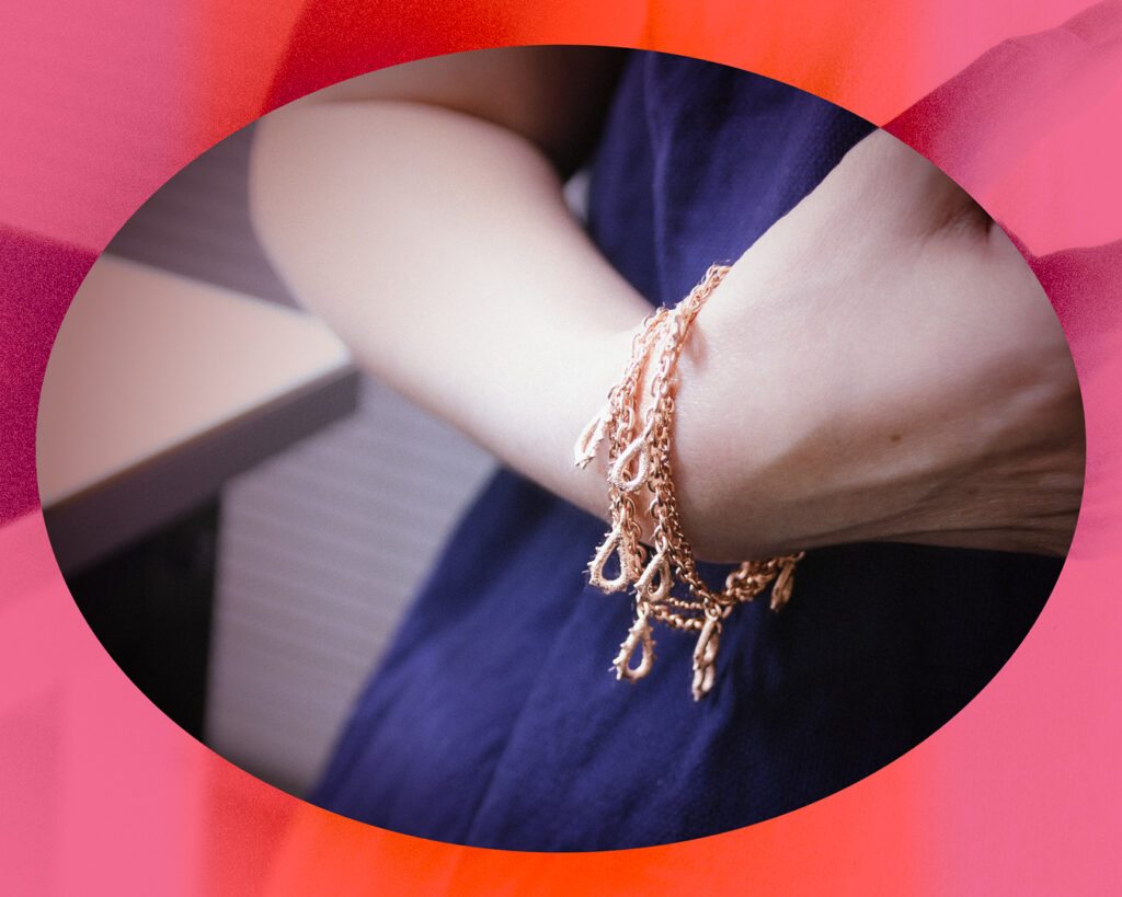 モデルの手首は約15cm、ブレスレットの長さは18cmをつけています。これで手の甲に少し垂れます。ぴったりサイズより自分の手首プラス3cmくらいで作るといいかと思います。