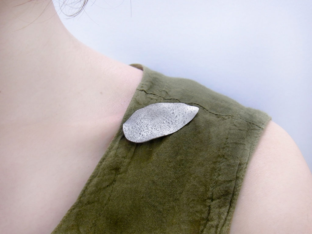 ブローチ金具はてっぽうタイプを使っています。こちらの金具は、つまみをスライドさせたら筒の中に針の先端がすっぽり収まります。スライドさせたつまみを元の場所にカチッと戻せば、これで安心安全です。しっかり針が収まっていれば落とす心配は無くなります。慣れると小気味良くてっぽう(筒)の開閉が出来るでしょう。