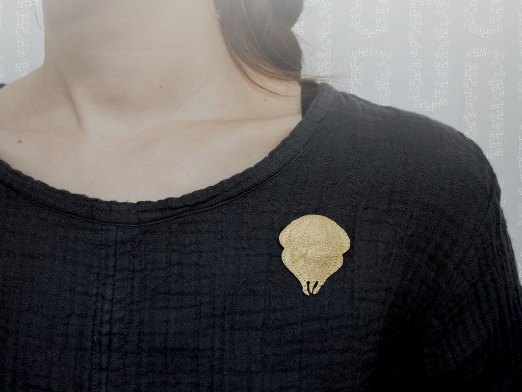 ブローチ金具はてっぽうタイプを使っています。こちらの金具は、つまみをスライドさせたら筒の中に針の先端がすっぽり収まります。スライドさせたつまみを元の場所にカチッと戻せば、これで安心安全です。しっかり針が収まっていれば落とす心配は無くなります。慣れると小気味良くてっぽう(筒)の開閉が出来るでしょう。