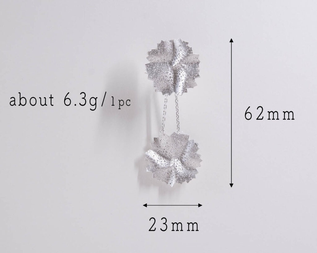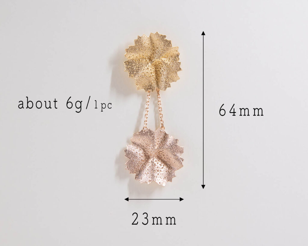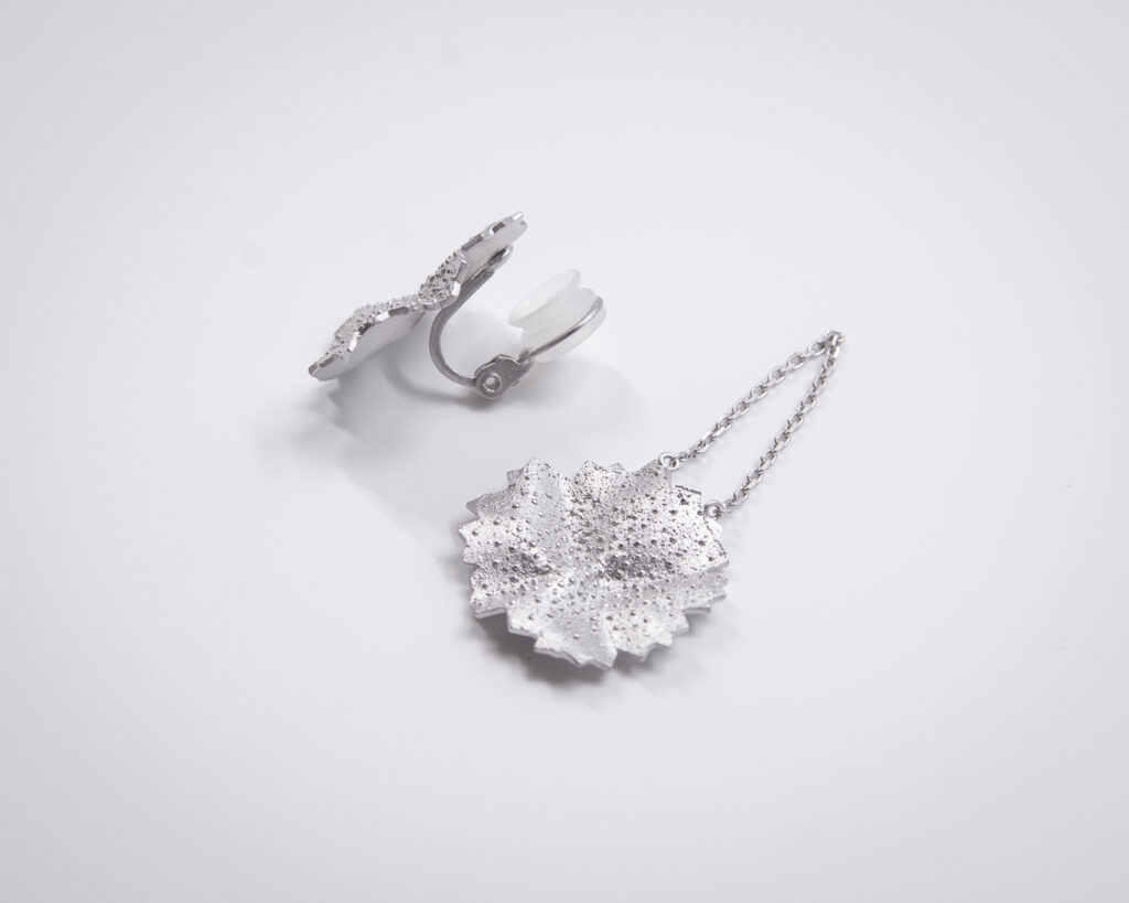 クリップイヤリング:イヤリング金具は微調整タイプで、耳たぶに挟んで指でキュッと絞めるだけです。長時間つけても痛くならないと好評ですが、このタイプは長く使っていくとだんだんとかしめが緩くなる弱点もあります。なるべくクリップを全開せず耳たぶの厚みくらいにだけ開いた状態で装着してください。